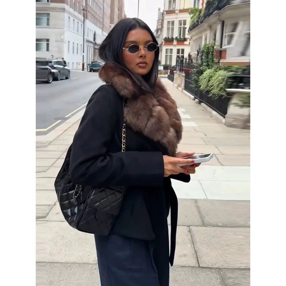 Der Aleyna Mantel mit Fellkragen vereint Eleganz und Wärme in einem edlen Design. Der voluminöse, weiche Kunstfellkragen verleiht jedem Outfit ein luxuriöses Finish, während der taillierte Schnitt deine Figur perfekt in Szene setzt. Ein Must-have für die kalte Jahreszeit!