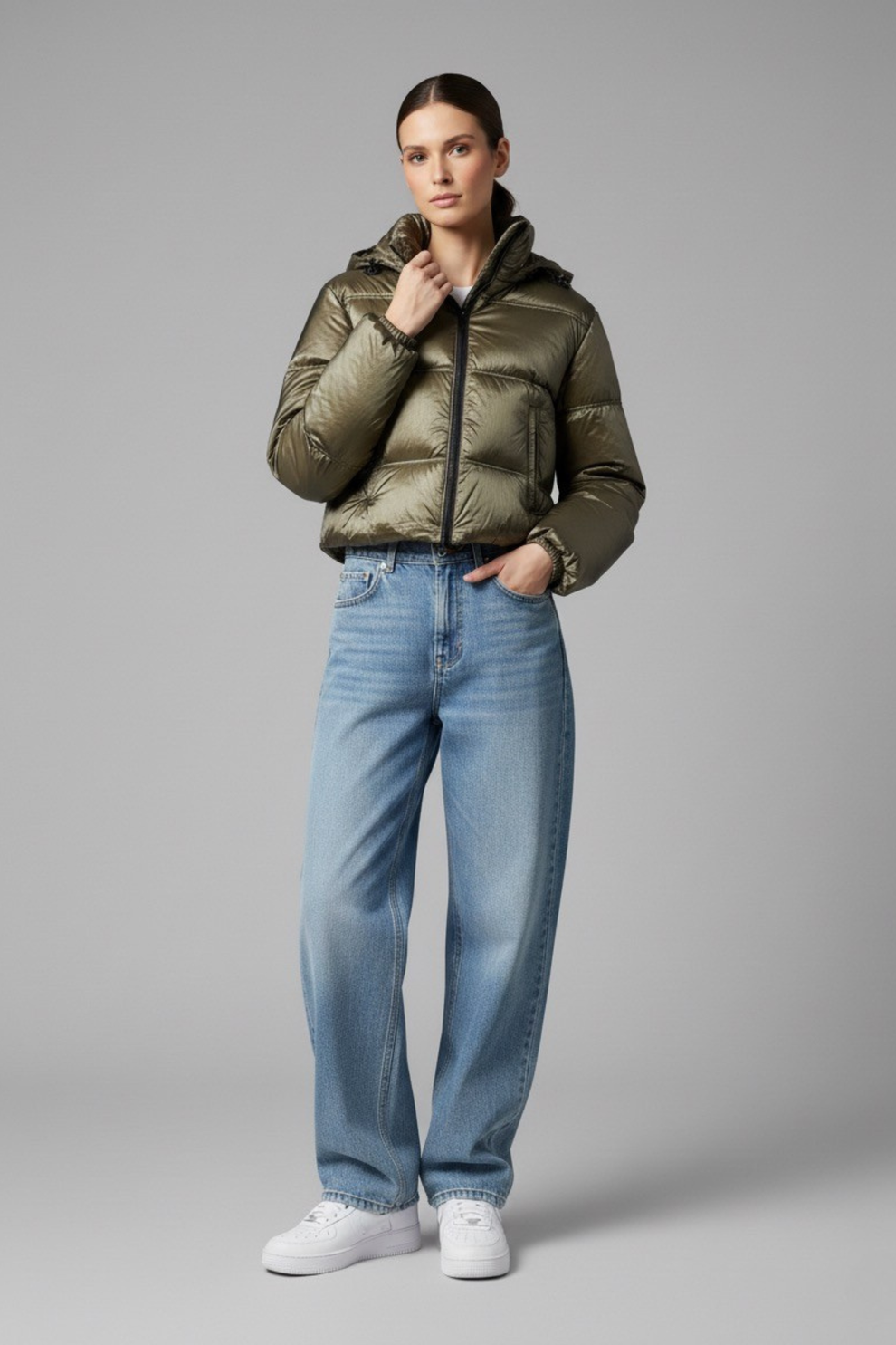 Diese stylische Steppjacke mit modernem Metallic-Finish sorgt für einen auffälligen und dennoch edlen Look. Das glatte, leicht glänzende Material verleiht ihr eine exklusive Note, während die wärmende Kunstseidenfüllung für angenehmen Tragekomfort sorgt. Mit ihrem lässigen Oversized-Schnitt, der Kapuze und dem Reißverschluss ist sie das perfekte Fashion-Statement für coole Wintertage.