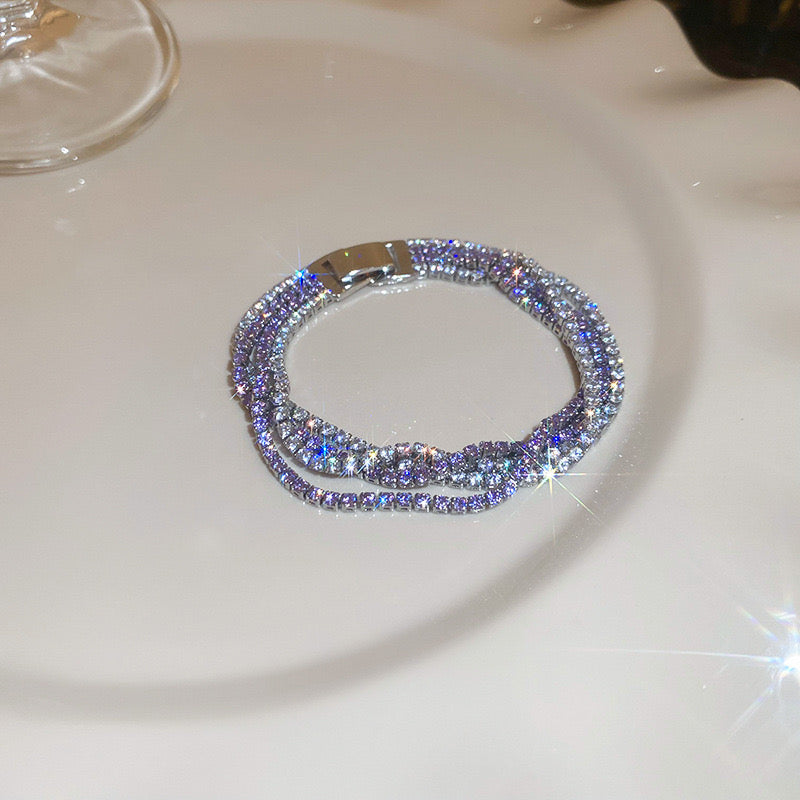 Funkelnde lila Kristalle in mehreren Reihen machen dieses Armband zu einem echten Blickfang. Es ist modern, auffällig und trotzdem elegant – ideal für Partys oder stilvolle Alltagslooks.